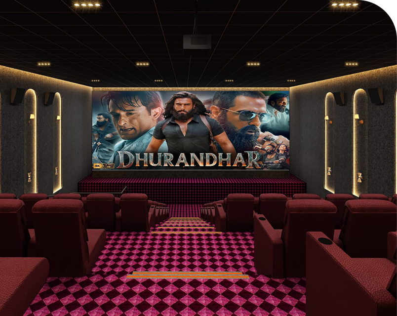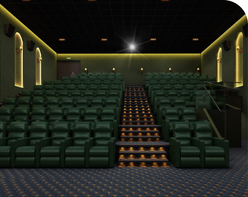 Experience cinema in rich shades of elegance at CITARA. The deep emerald color seating and patterned carpet blend seamlessly with warm ambient lighting and textured walls, creating a luxurious, intimate atmosphere.