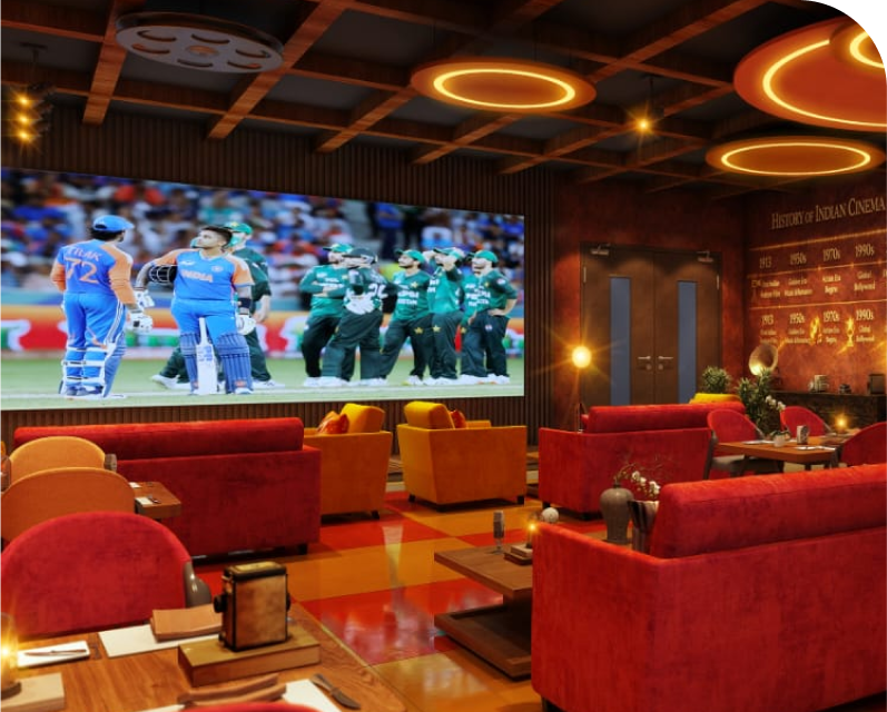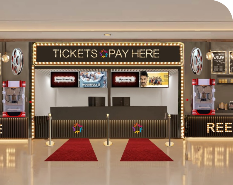 Welcome to our filmy-themed Box Office & Concessionaire — where every visit begins like a movie premiere. Designed with iconic cinema elements, classic marquee styling, and a lively café setup, the space captures the true essence of Bollywood and the big-screen experience