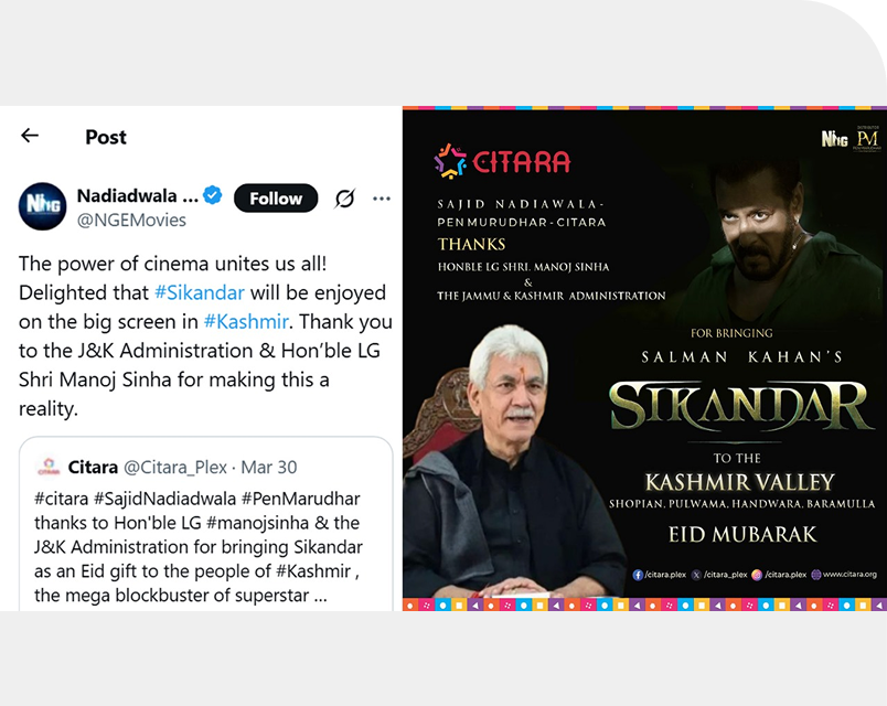 Sajid Nadiadwala, Citara, & Pen Marudhar thanks to Hon’ble LG J&K Shri Manoj Sinha and J&K Administration for bringing Sikandar as an Eid gift to people of Kashmir
