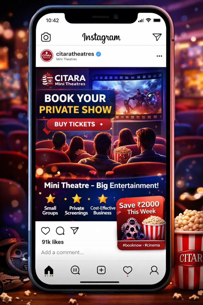 First, unlike traditional multiplexes, mini theatres focus on a smaller seating capacity (50–125 people) and personalised experiences. For example, Citara’s model converts traditional theatres into modern miniplex-style venues.